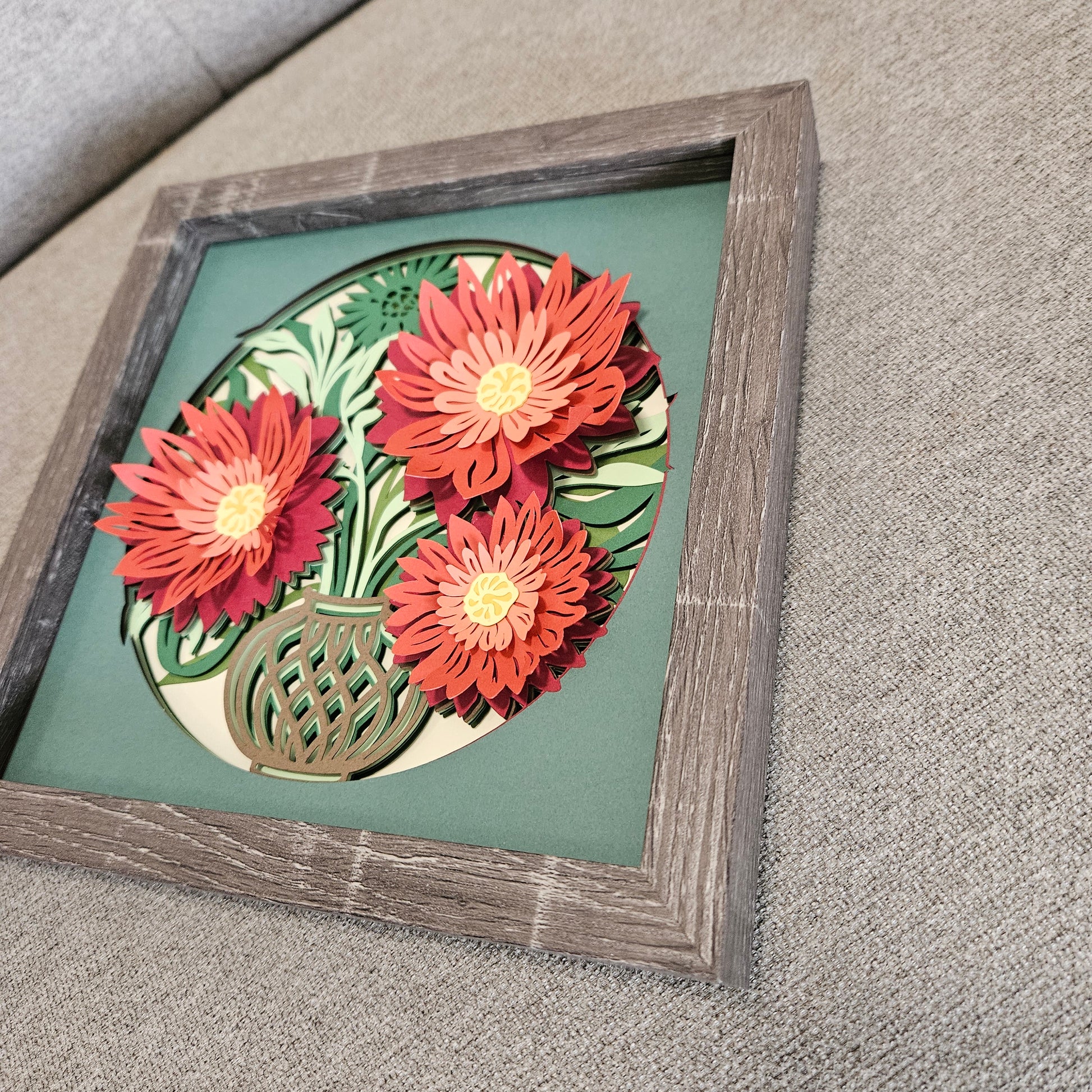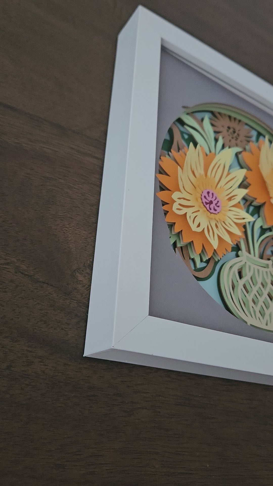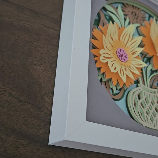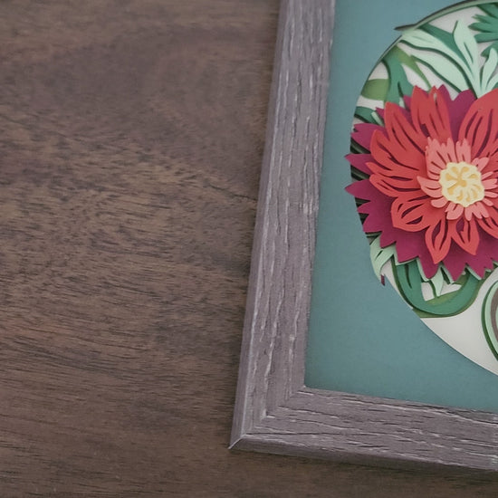 Capture the beauty of nature with our Shadowbox featuring flowers in a delicate vase. The 8x8 shadowbox and layered cardstock add dimension and depth, giving this piece a stunning and realistic appearance. Bring the vibrance of flowers into your home or office space with this unique and eye-catching wall art.