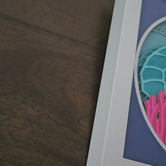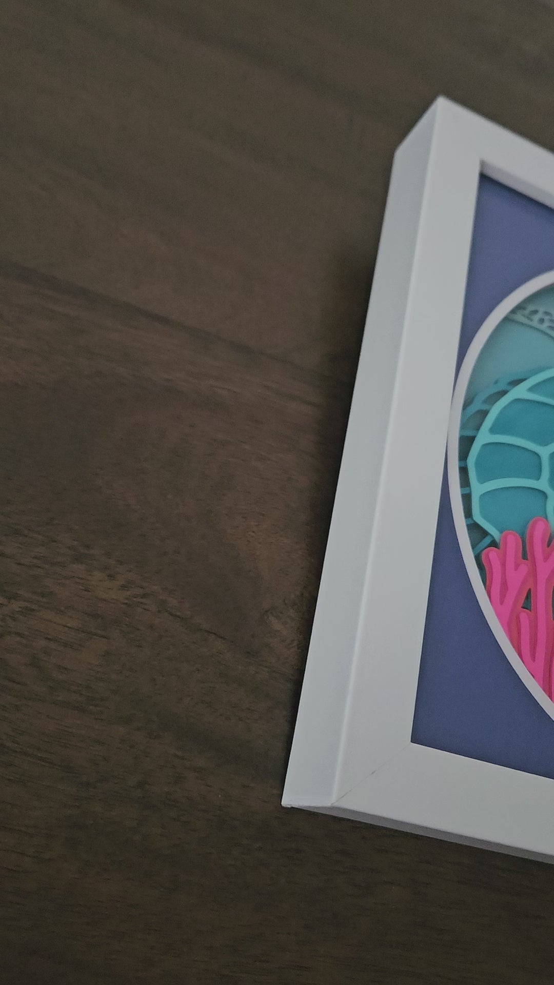 Unleash the beauty of the sea in your home with our Shadowbox - Sea Turtle. This 8x8 shadowbox features a captivating scene of a sea turtle swimming among vibrant pink fish and coral. Bring a sense of wonder and serenity to any room with this unique piece of art.