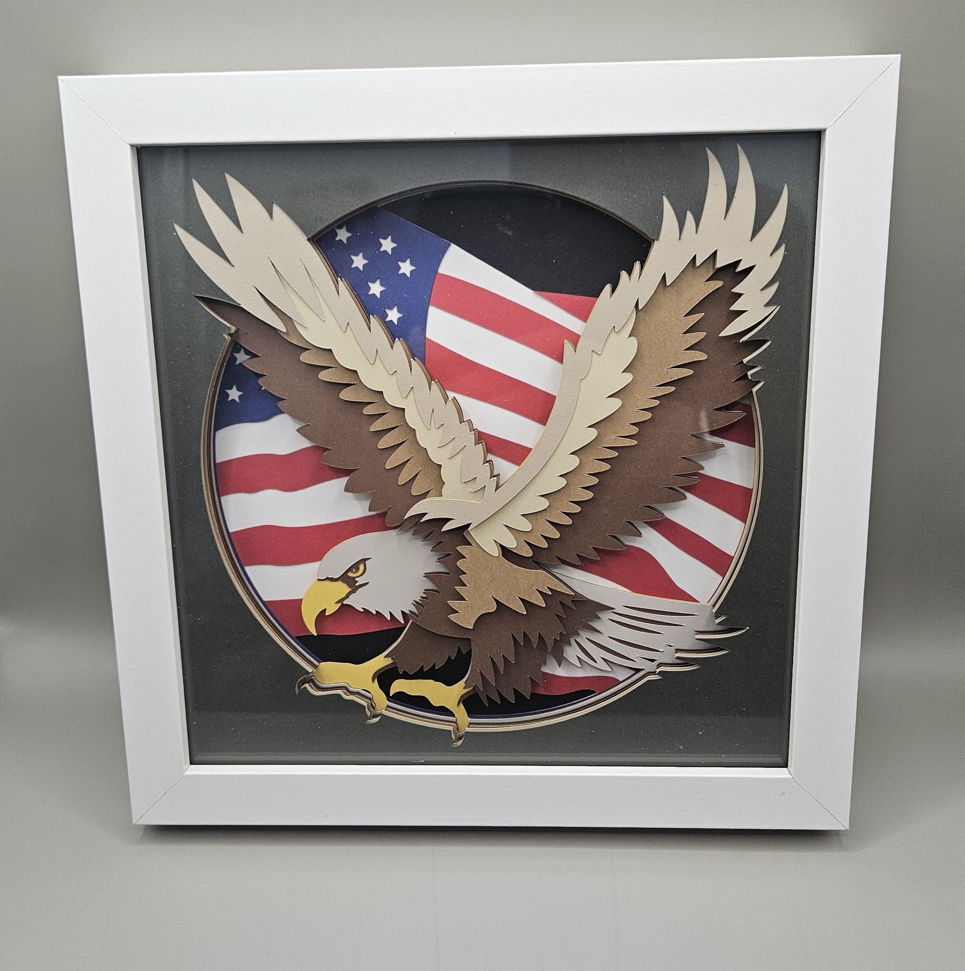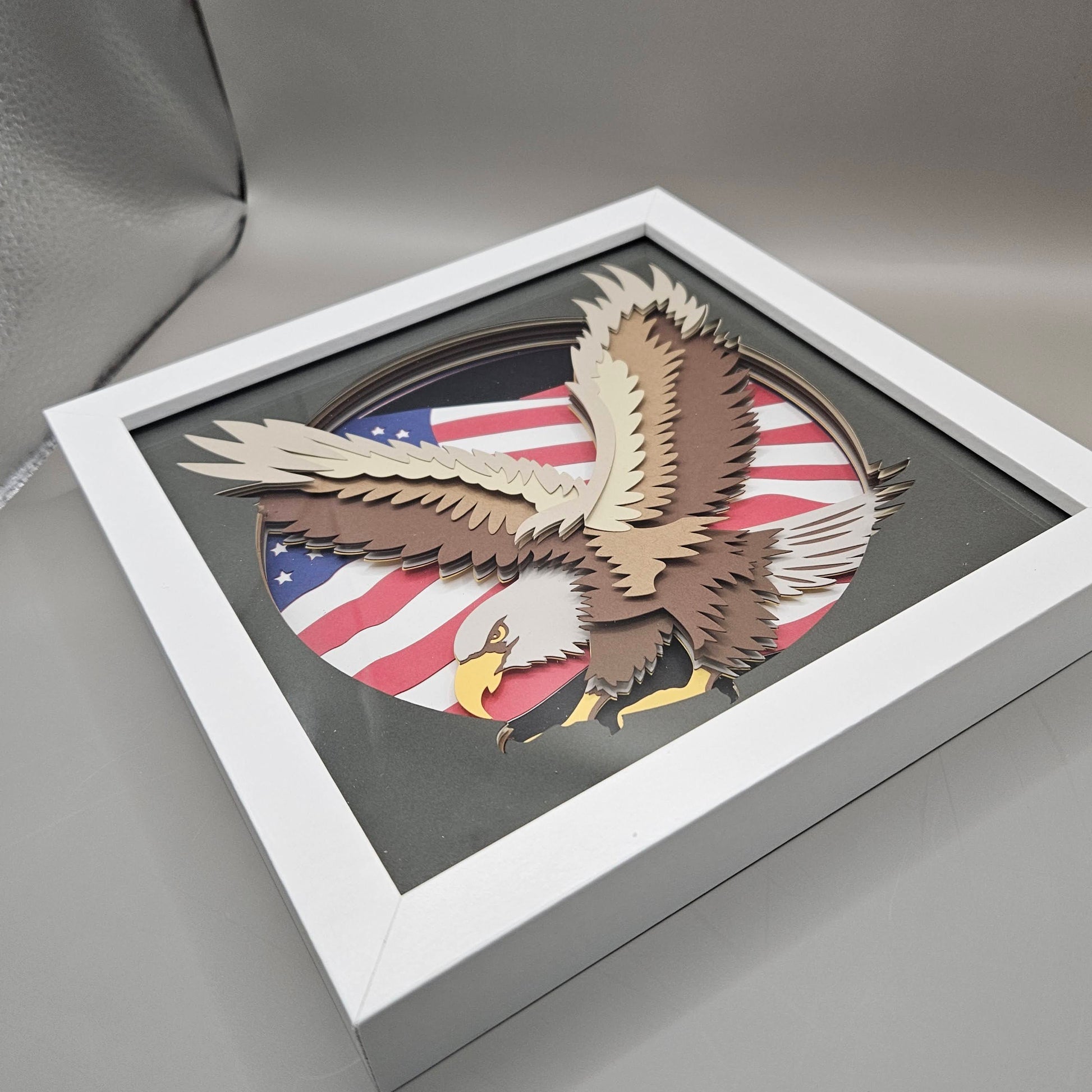 Show your pride for the USA with our 8" x 8" Shadowbox featuring a layered cardstock design of the American flag and a majestic eagle. Perfect for displaying in your home or office, this piece is a great way to show your support and patriotism.